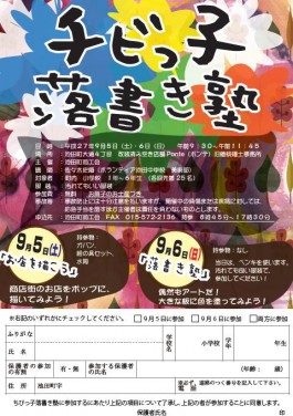 池田町の未来を担うこども達に商店街へ来て遊んでもらうことで、地域への愛着心を芽生えさせ、こどもの自由な発想による独創的なアートを創出することにより、こどもの創造力向上に寄与することを目的に「チビっ子落書き塾」を開催します。