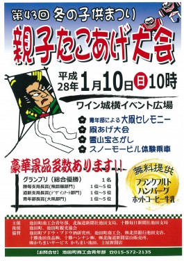 凧あげは、飛距離部門・デザインアート部門・大凧部門があり、豪華景品を多数用意しております。 ※凧は手作りのもの、市販のもの等ご持参ください。